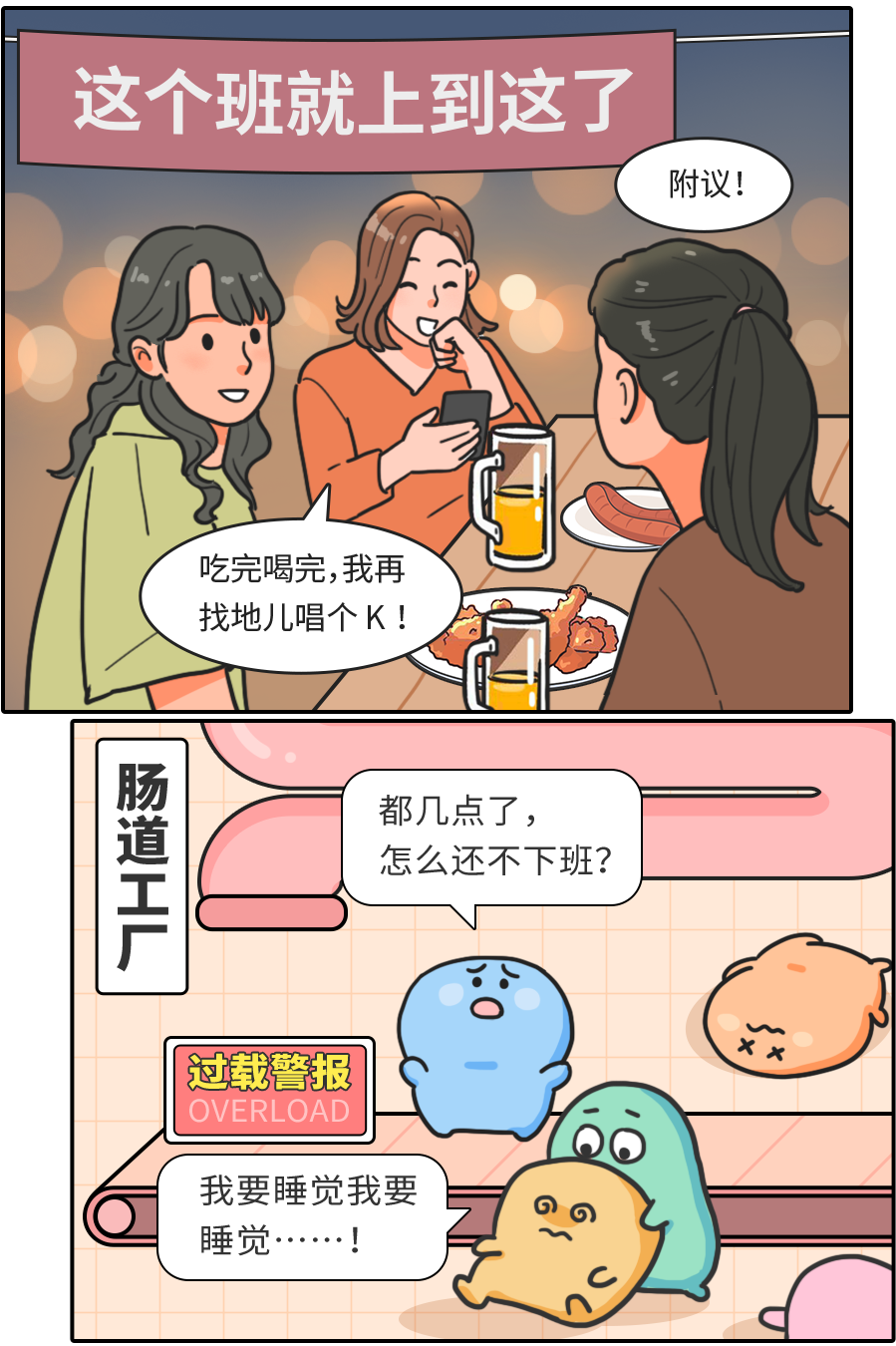 但这群益生菌,有健康的生活习惯,爱吃蔬菜瓜果,习惯规律作息,熬夜吃夜宵打破了原本的节奏,很可能「激怒」它们,于是集体罢工,甚至可能会被更多的有害菌「侵占」地盘,肠道菌群平衡被破坏,遭遇拉屎困难的「暴击」[1]。