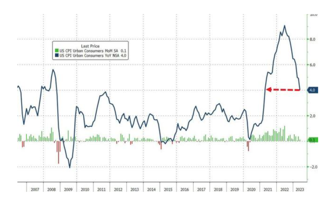 美国5月CPI同比上升4%,连续第11次下降,预期4.1%,前值4.9%;