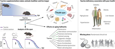 虽然动物研究表明牛磺酸与衰老有关,但没有直接观察因果关系。可能存在一种或多种与牛磺酸相关或衍生自牛磺酸的代谢物,这些代谢物与衰老的分子机制有关。