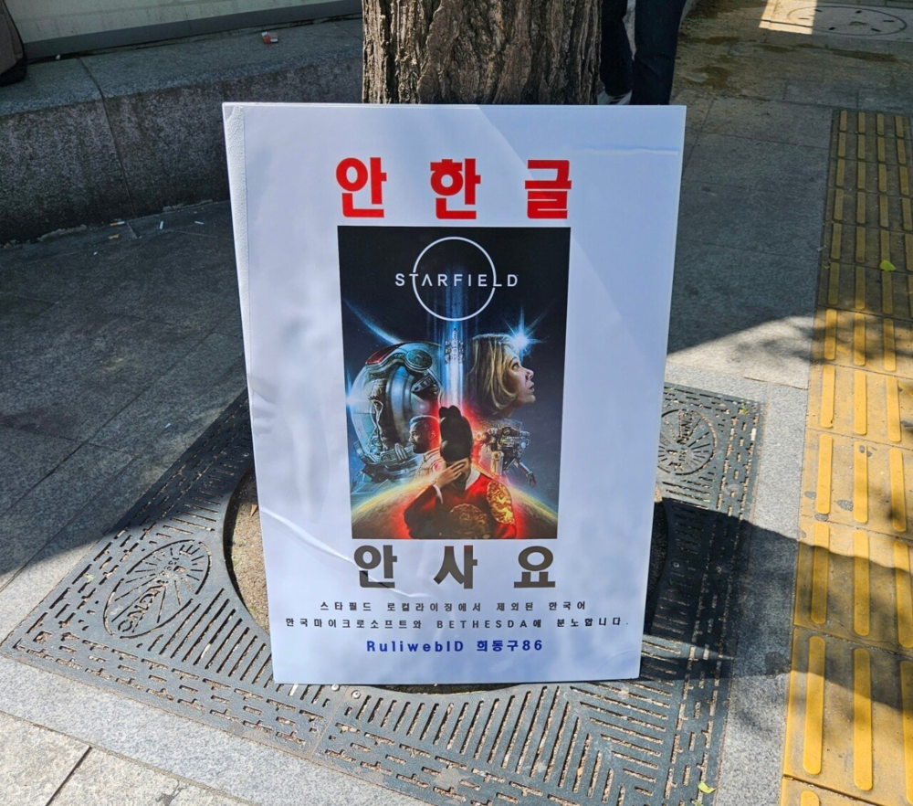 游戏社区Ruliweb的一位勇士,最近跑到了微软的韩国驻在,拉起了“안한글안사요 - 除非你的游戏支持韩语,否则我不会买它 ”的易拉宝。