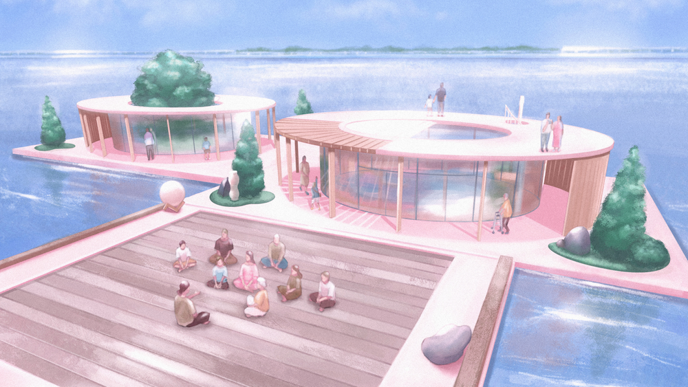 道元城的外围是一个可居住的巨大圆环,圆环创造海湾,能抵御海啸等恶劣天气的侵袭。水面下是海底数据中心以及食物生产基地等基础设施,为城市提供食物、电力、水和医疗设施。圆环内则是诸多可以灵活更改的浮动建筑,为城市功能保留重新配置的发展空间。