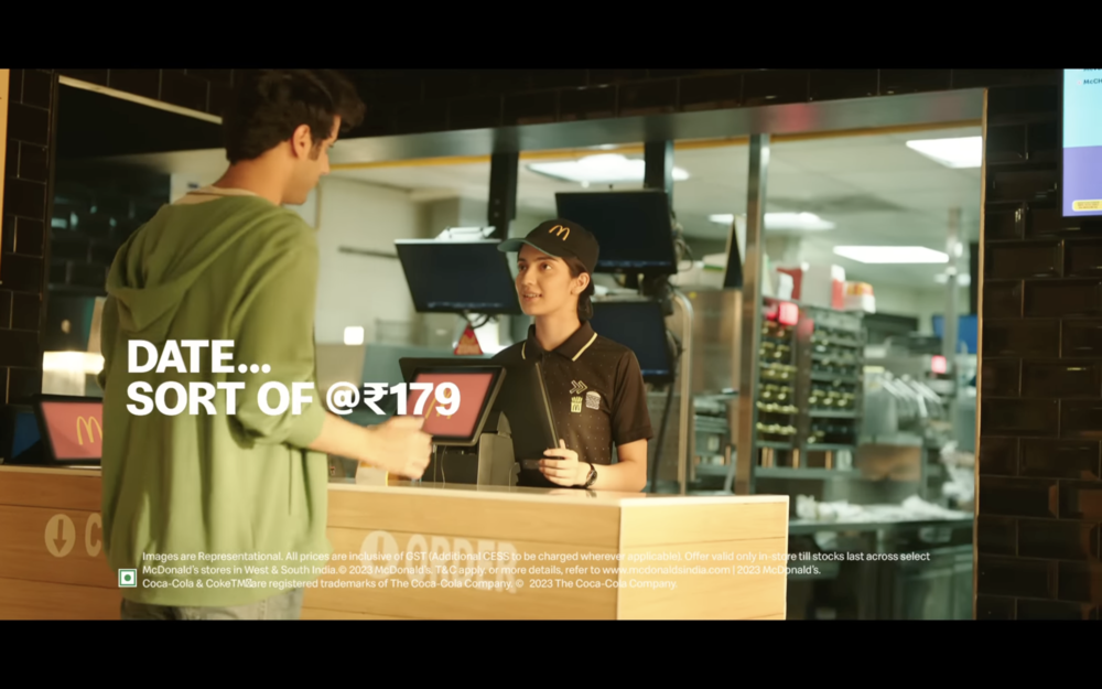 广告中,一位男性顾客对漂亮的女性服务员非常感兴趣,两次排队都选择了女性服务员的柜台,希望能和她约会。一段看似唯美的爱情就要在麦当劳点餐柜台开启。
