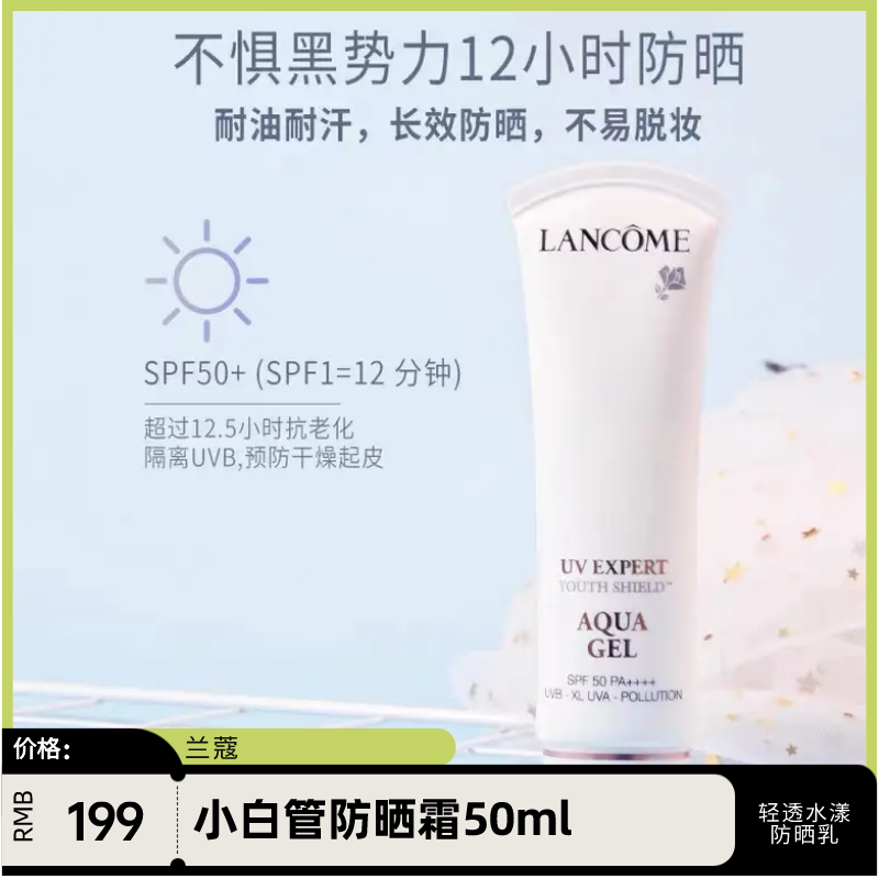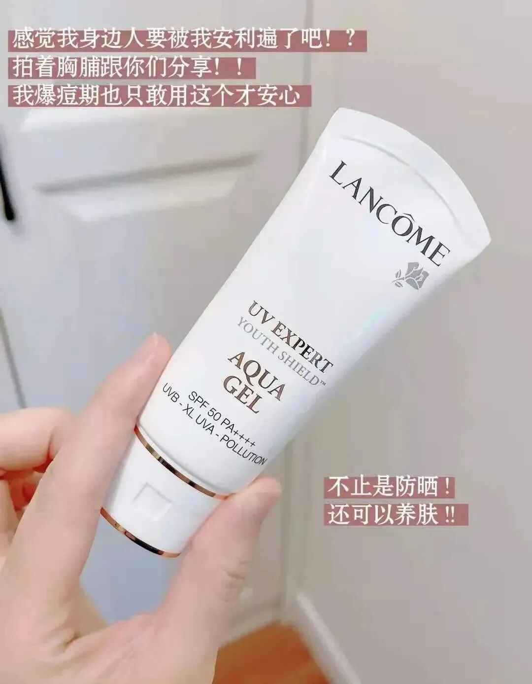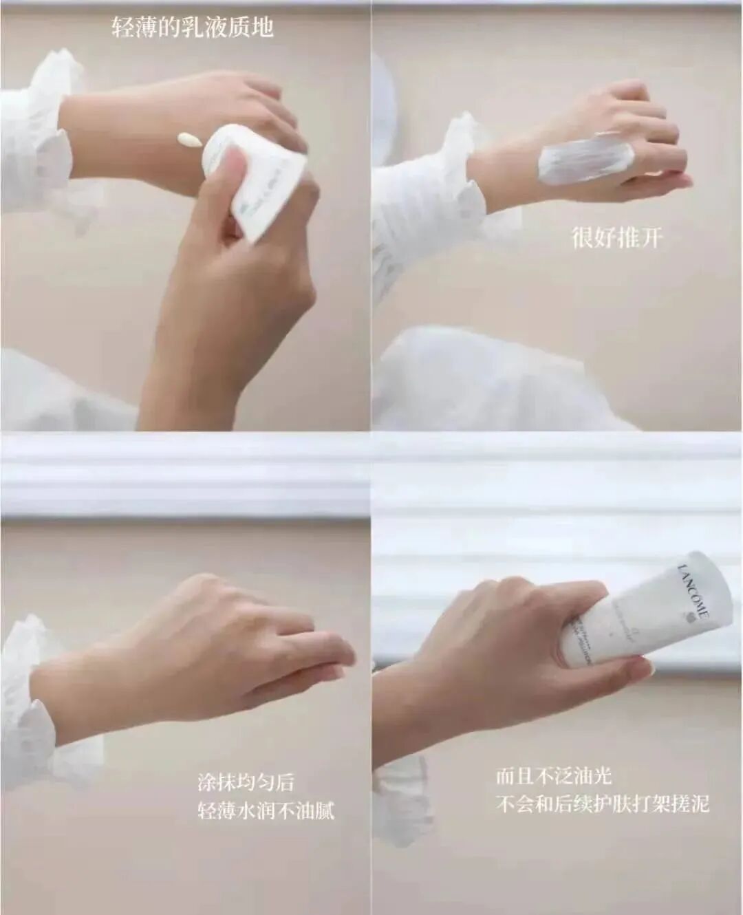 先尽量均匀密集地点涂,再顺着皮肤纹理向一个方向推开,能帮助防晒霜更好的成膜;身体防晒也是一样,不要为了让它吸收,大力拍打或者来回大圈揉搓。如果带妆后再补防晒,可以将乳液挤在化妆棉上,轻轻擦拭表面的底妆,摸一摸不黏的时候就可以重新涂抹防晒,等成膜后再用气垫按压补妆。这样的妆面会非常完美且滋润服帖哟。兰蔻这支小白管太多人写了空瓶记,涂抹它后我们的肌肤就像穿上了轻盈的隐形保护伞,一次性将紫外线、蓝光通通挡在外!👇👇👇