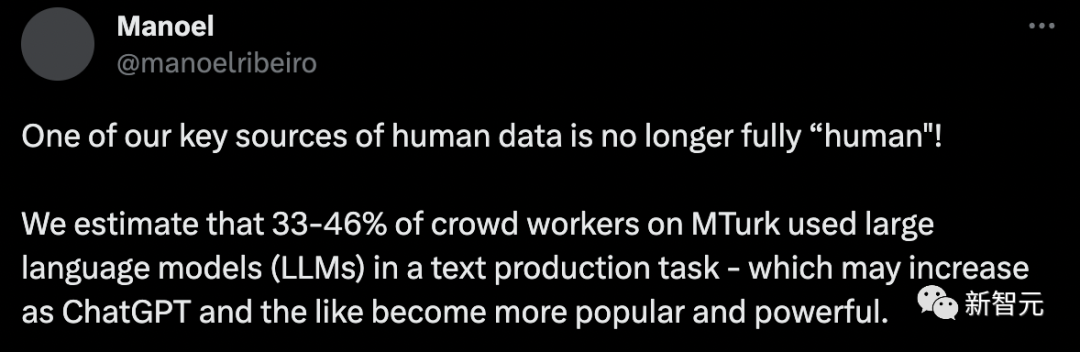 论文地址:https://arxiv.org/abs/2305.17493v2但现在的问题在于——你以为的「人类数据」,可能并不是「人类」写的。洛桑联邦理工学院(EPFL)的最新研究称,预估33%-46%的人类数据都是由AI生成的。毫无疑问,现在的大语言模型已经进化出了相当强大的能力,比如GPT-4可以在某些场景下生成与人类别无二致的文本。但这背后的一个重要原因是,它们的训练数据大部分来源于过去几十年人类在互联网上的交流。如果未来的语言模型仍然依赖于从网络上爬取数据的话,就不可避免地要在训练集中引入自己生成的文本。对此,研究人员预测,等GPT发展到第n代的时候,模型将会出现严重的崩溃问题。那么,在这种不可避免会抓取到LLM生成内容的情况下,为模型的训练准备由人类生产的真实数据,就变得尤为重要了。大名鼎鼎的亚马逊数据众包平台Mechanical Turk(MTurk)从2005年启动时就已经成为许多人的副业选择。科研人员可以发布各种琐碎的人类智能任务,比如给图像标注、调查等,应有尽有。而这些任务通常是计算机和算法无法处理的,甚至,MTurk成为一些预算不够的科研人员和公司的「最佳选择」。就连贝佐斯还将MTurk的众包工人戏称为「人工人工智能」。除了MTurk,包括Prolific在内的众包平台已经成为研究人员和行业实践者的核心,能够提供创建、标注和总结各种数据的方法,以便进行调查和实验。然而,来自EPFL的研究发现,在这个人类数据的关键来源上,有近乎一半的数据都是标注员用AI创建的。![]()