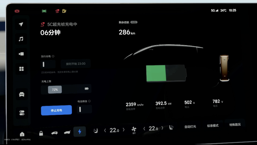 第二,对电池系统进行优化,更充分地利用电池的 5C 充电倍率,实现峰值 500 千瓦以上的充电功率。在零下 10 度到高温 40 度的宽温域内,理想的纯电动汽车都能做到充电 9 分 30 秒,续航 400 公里,充电 22 分钟,续航 600 公里,在单次长途出行补能效率上,和燃油车几乎打平。