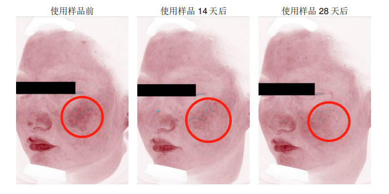 并且!在使用 14 天后,受试者脸上泛红的状况,显著改善;使用 28 后,皮肤泛红的状况趋近于健康状态。
