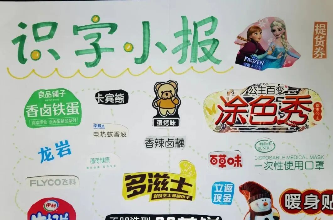 学生在生活中识字,动手从商品纸盒、广告标识、报纸杂志门牌等处,或拍照,或直接剪贴在8开纸中,配上有趣的图案等。将准备好“生活识字小报”带到现场,老师抽指其中五个,学生认读。