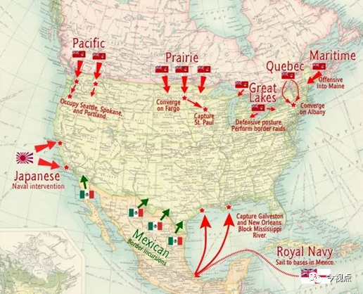 最匪夷所思的是,1921年,背靠大佬的加拿大,搞了个十分大胆的方案,叫“防卫计划1号”,准备联合英国、墨西哥和日本,一起瓜分美国……