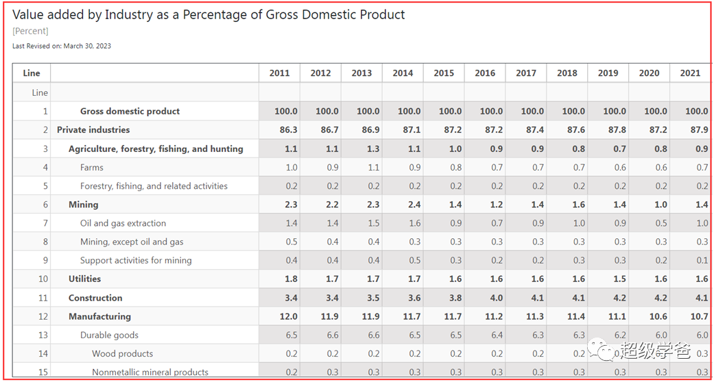 2011年美国的制造业还占GDP的12%,他下台的2016年已经跌到了11.1%。川建国比他喊得还响,下台时跌到了10.6%。