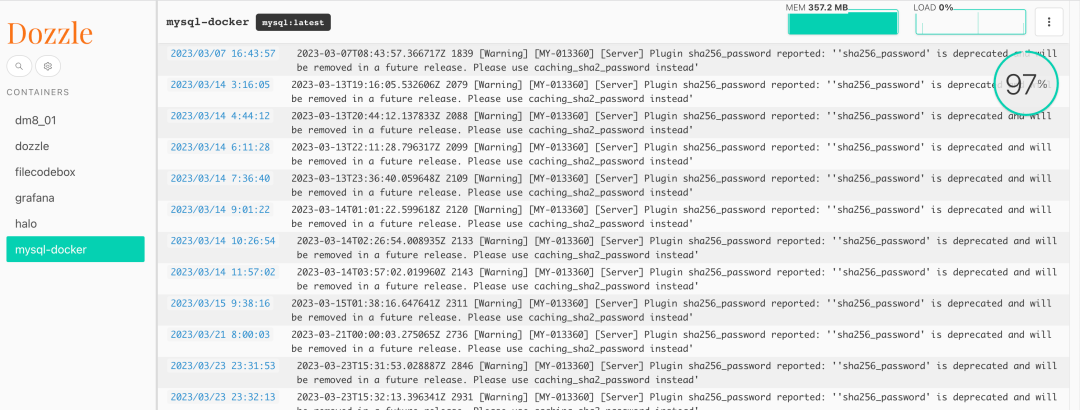 点击右侧列表的一个容器,可以跳转到该容器的日志界面。比如我点击运行的 MySQL 容器,日志如下: