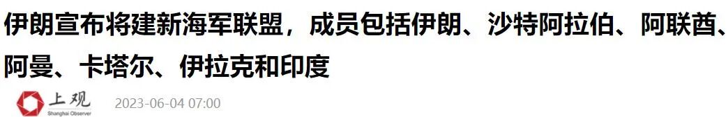 据参考消息报道,伊朗海军司令沙赫拉姆·伊拉尼6月2日宣布,海湾地区将组建一个新的海军联盟,成员包括伊朗、沙特阿拉伯、阿联酋、阿曼、卡塔尔、伊拉克和印度。