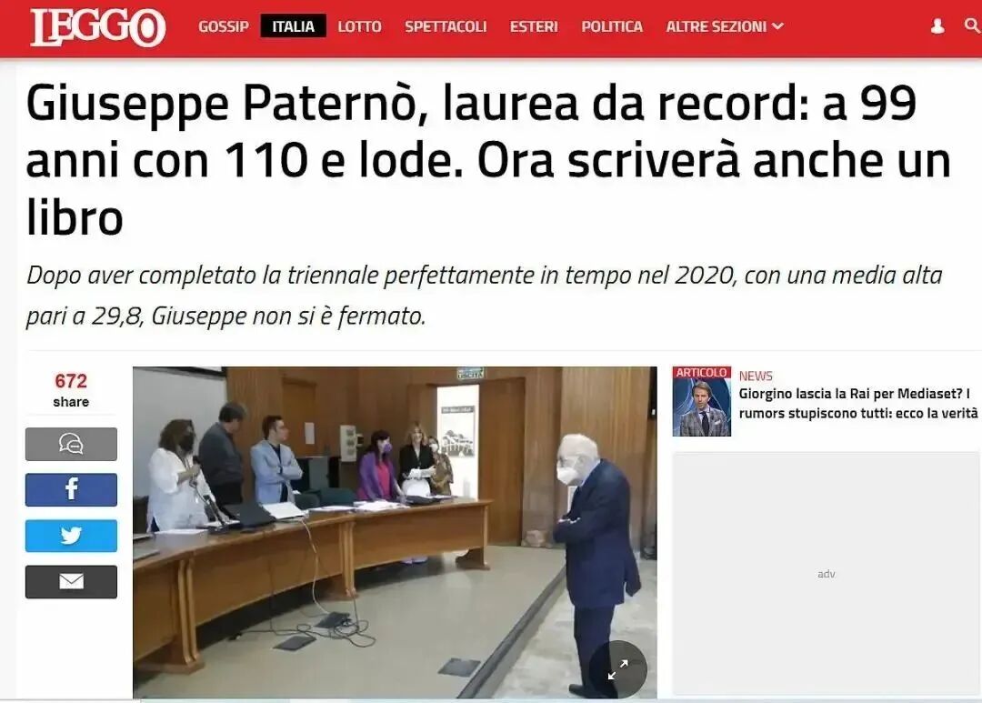 图:意大利媒体《LEGGO》对99岁获硕士学位老人的报道。这位老人名为朱塞佩·帕特诺 (Giuseppe Paternò)