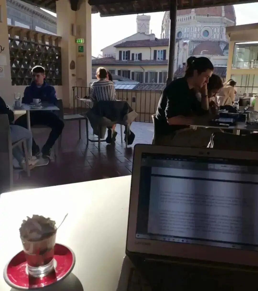 图:岱琳在佛罗伦萨的咖啡馆写论文