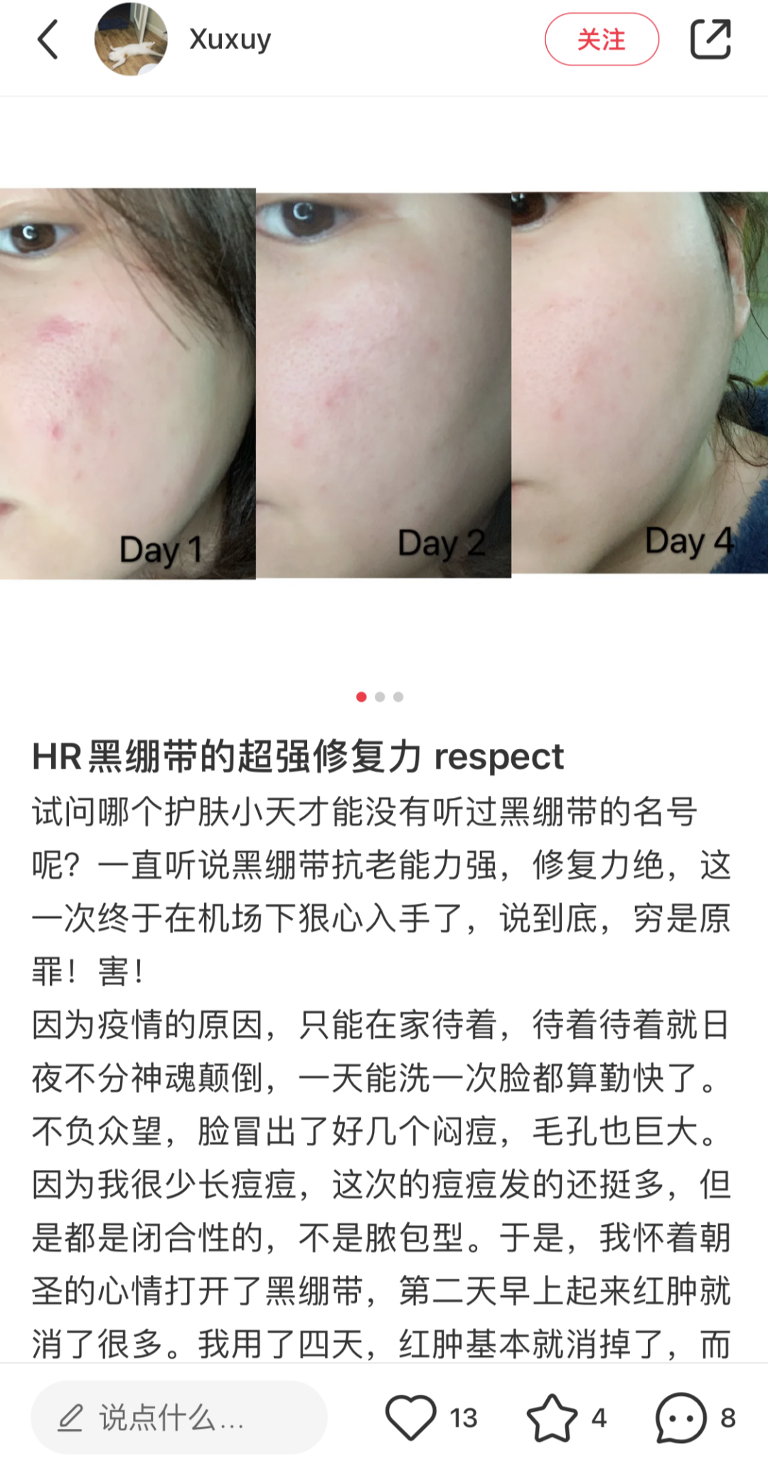 但是自从用了赫莲娜黑绷带之后,我前天去的医美隔天就能出门,修复效果巨强!!而且我最近发现眼周的眼纹好像因为长期用赫莲娜这款都变淡了。”