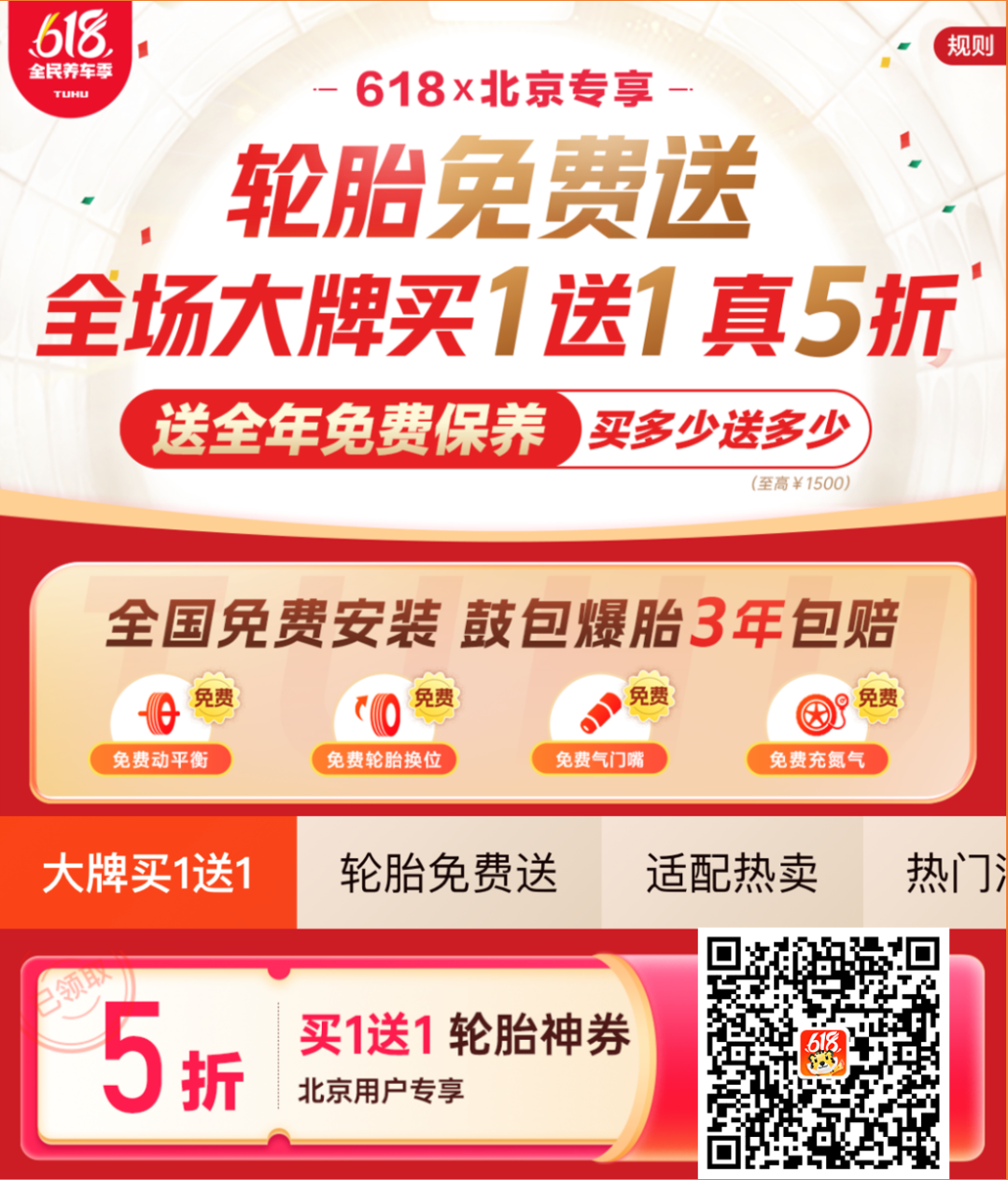 除此之外,北京地区还有特殊福利,在北京途虎养车店安装轮胎,可以享受“买一赠一”。