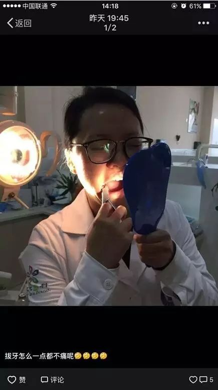 照片里,这位穿着白大褂的女医生,坐在凳子上,左手拿着镜子,右手拿着拔牙工具,亲手拔下了自己口腔右侧的第二颗磨牙(右下排第七颗牙齿)。并在朋友圈里晒出了拔牙的照片,随图配文还是“拔牙怎么一点都不痛呢”。