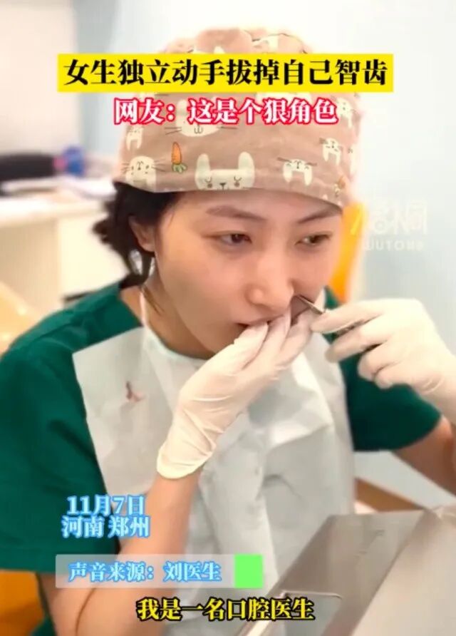 当事人刘医生表示,自己是一名牙科医生,她之前看到有外国医生自己拔牙,于是也决定挑战一下拔智齿。