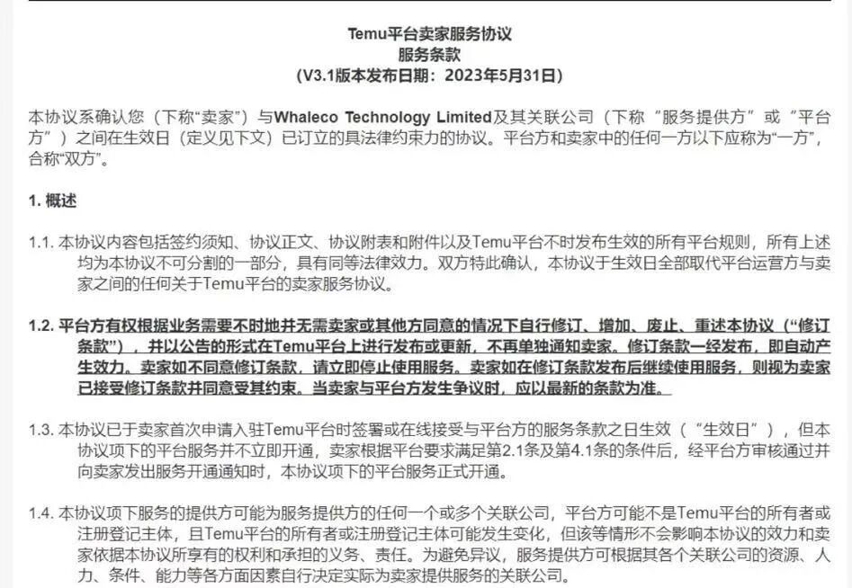 图源:网络而这不是TEMU第一次表现得非常霸道,最新的平台卖家服务协议中,出现以下内容:“平台方有权根据业务需要不时地并无需卖家或其他地方统一的情况下修订、增加、废止、重述本协议。”与此同时,TEMU在协议中表示平台对入库商品的退货拥有最终解释权。也即是说,TEMU与供应商处于不平等关系中。把这种矛盾具象化,比较突出的有:供应商太多,买手对接不过来,常常不回复信息;质检不通过会被退货,但有人发现不同仓库的质检标准不同,质检人员资质成谜;退货物流采用顺丰到付,最夸张时运费可能比货品价值还高……一大批卖家咒骂TEMU,准备清货退坑,劝阻还没入局的卖家千万别加入。然而,平台上的大卖已经出现,从销量来看,薄利多销也能赚到钱。![]()