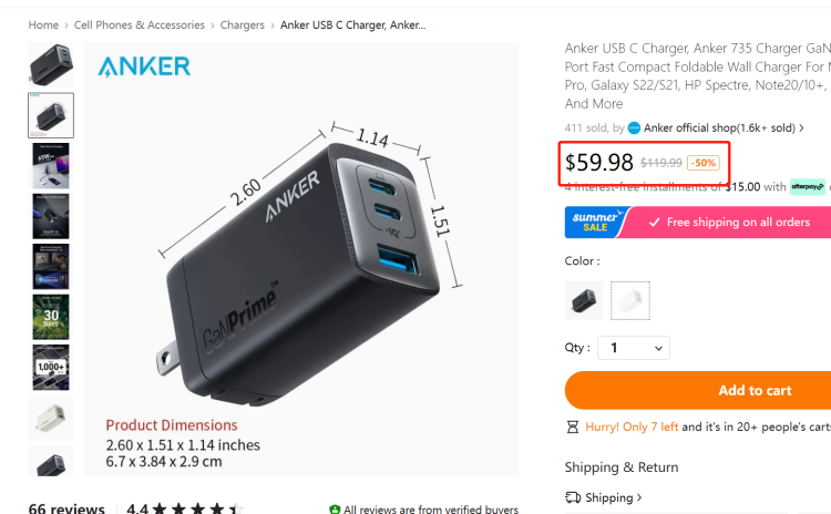 图源:TEMU编者发现3C领域知名品牌Anker已在TEMU开设官方店铺,上架的商品种类不多,店铺销量不到两千单。价格方面,以图中的充电头为例,对比其他渠道几乎一致,但前台显示为享受五折优惠。