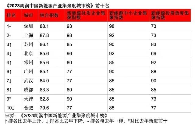 6月19日发布的《2023胡润中国新能源产业集聚度城市榜》显示,深圳、上海、苏州位列前三,北京、常州则并列第四,广州、武汉、成都、天津和合肥分列6-10位。