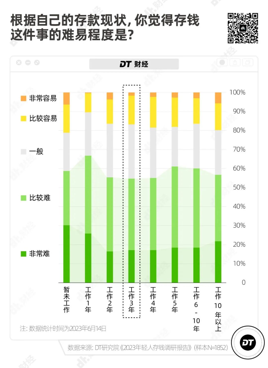 工作第1年(选择比较难和非常难的比例为66.9%)是存钱最难的时候——起步工资不高、房租开销大、还有各种适应人生新阶段的支出……“打工返贫”的玩笑可能成为现实。