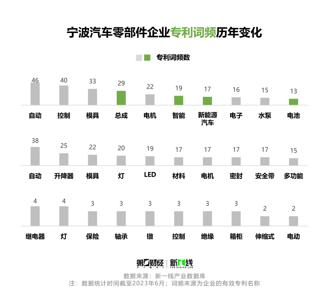 根据第一财经•新一线城市研究所的统计,以五年为一个周期,分别统计宁波汽车零部件领域高新技术企业、科技型中小企业专利简介的词频可以看到,宁波近五年汽车零部件的核心技术突破正在从车灯、安全带等基础软装向智能化、新能源化的方向倾斜。