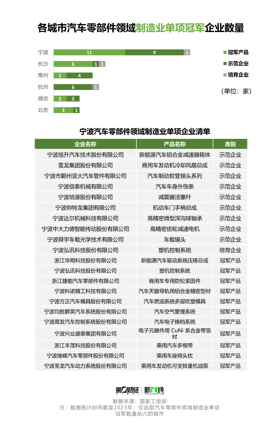 根据第一财经•新一线城市研究所的统计,宁波规模以上汽车制造业企业在长三角头部城市中规模及利润均排名第一,龙头企业带动效应显著。作为“单项冠军之城”,宁波不仅是中国制造业单项冠军企业最多的城市,在汽车零部件领域,制造业单项冠军企业更是占全国的15.67%。冠军产品以各类模具、紧固件和汽车总成为主。