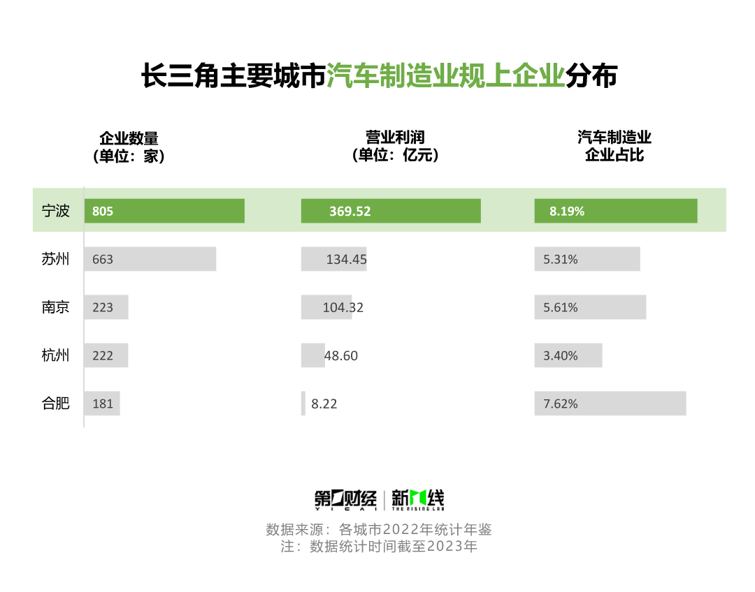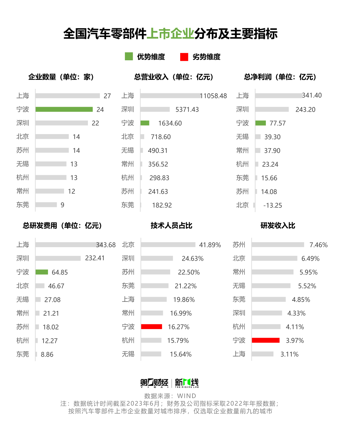 宁波汽车及零部件产业不仅占据了浙江省的半壁江山,而且根据第一财经•新一线城市研究所的数据,宁波汽车零部件上市企业数量仅次于上海,超过深圳、北京,共24家。上市企业的总营业收入、净利润排在全国第三。