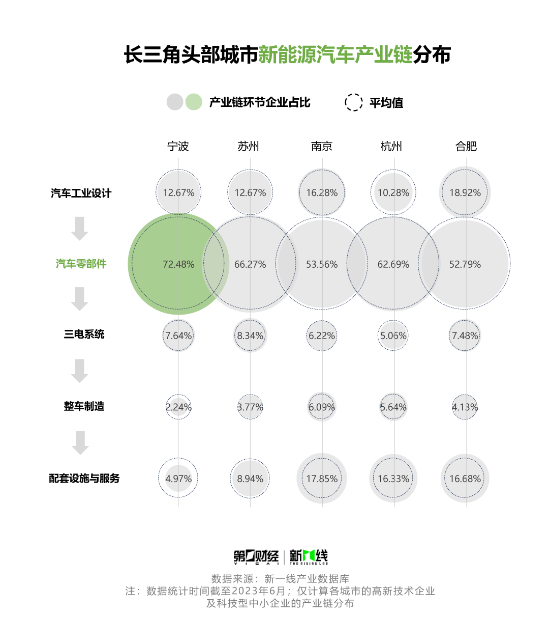 第一财经•新一线城市研究所对长三角头部城市新能源汽车企业进行产业链匹配后还发现,宁波在汽车零配件领域占比最高,与其他城市相比产业集中度更有优势。其次,三电系统占比仅次于苏州,发展势头良好。