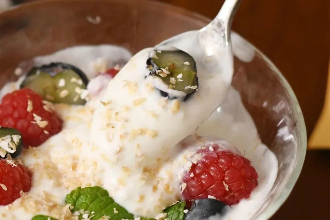 搅合搅合,等它和酸奶完美融合在一起后,夏日下午茶小甜点就做好啦,好吃还上镜。
