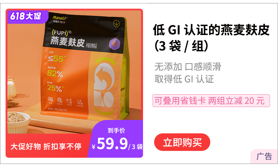 ManaGI 的燕麦麸皮还通过了权威机构的低 GI 检测认证,GI 值 53.5,妥妥的低 GI。