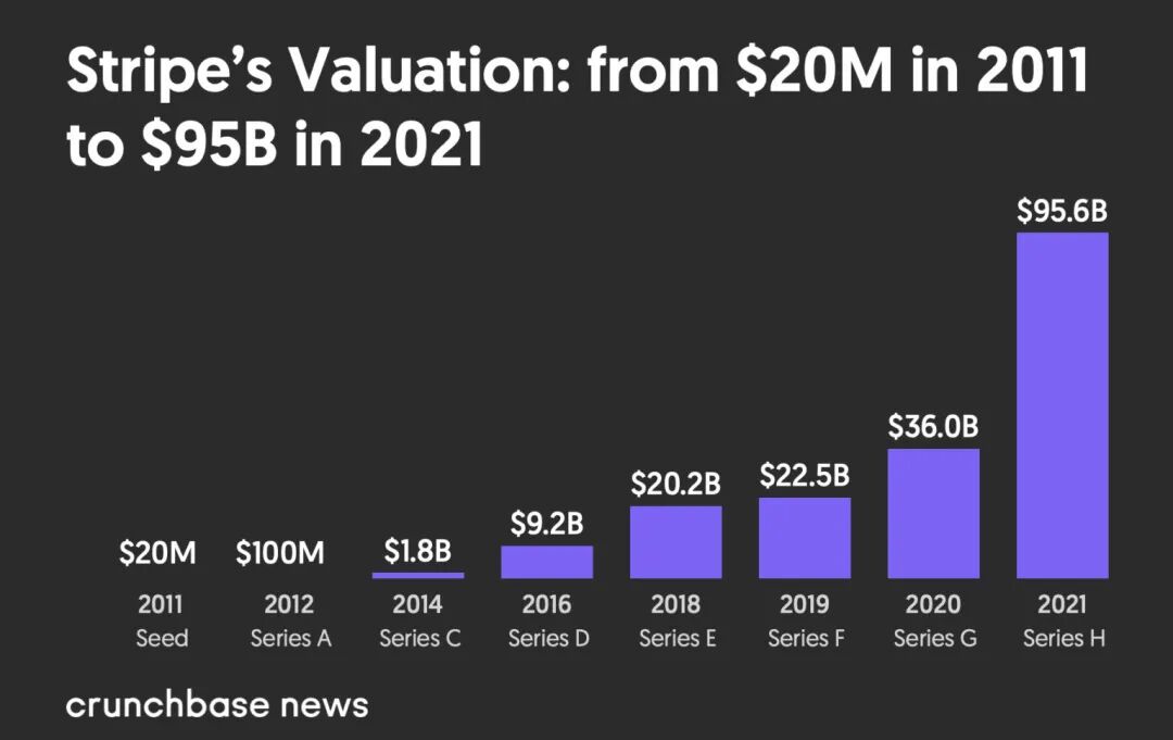 Stripe在此后的几年急速崛起。2021年,其估值达到了 950 亿美元,超过Space X 的 740 亿美元,成为了美国估值最高的未上市公司。