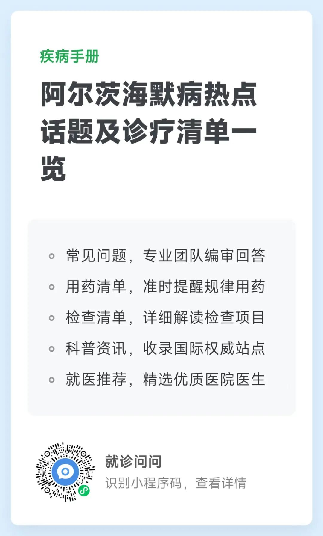 点击下方图片即可查看阿尔茨海默病疾病手册。除了阿尔茨海默病,就诊问问目前已经上线了高血压、糖尿病、痛风、鼻炎、痤疮、脂肪肝等多种 疾病手册,欢迎订阅并分享给有需要的人。