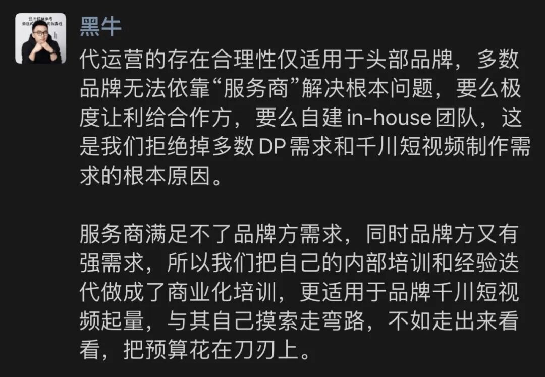 抖音内容建设约等于品牌建设,要么自建团队in house 下血本啃下这块硬骨头;要么与全案DP服务商深度捆绑合作(此处的DP不是指代播服务商,而是有强内容能力且具备直播能力、投流能力和泛商城运营能力的全案服务商)。