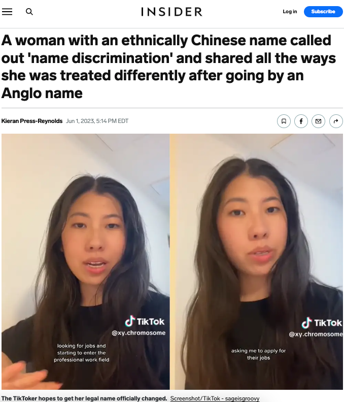 他说:“这是一种刻板印象,会让使用非英语名的求职者对自己产生怀疑。”