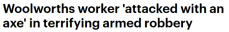 《每日邮报》6月19日报道,一名Woolworths的员工在被一名十几岁的青少年用一把“小斧头”袭击后受伤。周六晚上10点20分左右,这名员工在塔州霍巴特北部Claremont的Woolworths超市的装货码头上进行夜间补货。警方称一名15岁的青少年带着一把小斧头走近该员工,并袭击了该员工并威胁另一人。周六晚上10点20分左右,这名员工一直在塔州霍巴特北部Claremont的Woolworths的装卸码头工作(图片来源:《每日邮报》)据称,这名十几岁的青少年在逃离现场时从装货区的手推车上拿走了几箱饮料,并在逃跑过程中损坏了一辆停放的汽车。警方在不久后找到了这名15岁的青少年,并且在没有发生任何事件的情况下将其逮捕,饮料也被找回。警方称,一名15岁的青少年在袭击员工后威胁另一名员工之前用一把小斧头靠近(图片来源:《每日邮报》)警方确认,在事件发生时现场还有“另外两名青少年”,但在事态发展时逃离了现场。这名青少年被控严重武装抢劫罪,并将被拘留在看守所中等待出庭。如果有任何对此案件有了解或信息的人,请敦促他们与塔州警方或犯罪举报电话1800 333 000联系。![]()