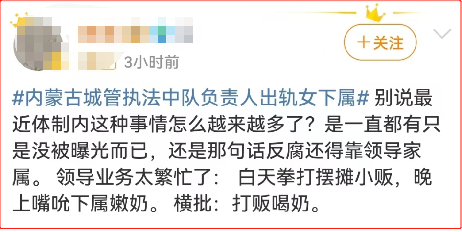 王大人和他的女下属尹某有没有暴力执法?有没有通过所谓的执法,变相获取两人的“活动经费”,此事要严查!如果通过搜刮小摊小贩,获取“高蛋白”,用来宣泄私欲,这是知法犯法,公权私用,如何对得起那些挣扎在生存线上的摊贩们?也难怪网友给他们送出了这样辛辣的一副对联:“白天拳打摊小贩,晚上()()下属()奶,横批打贩喝奶”!疫情过后,民生疾苦,生存不易,好干部不仅要“想干事、敢干事、能干事、干成事”,最重要的是要干正事——为人民服务!