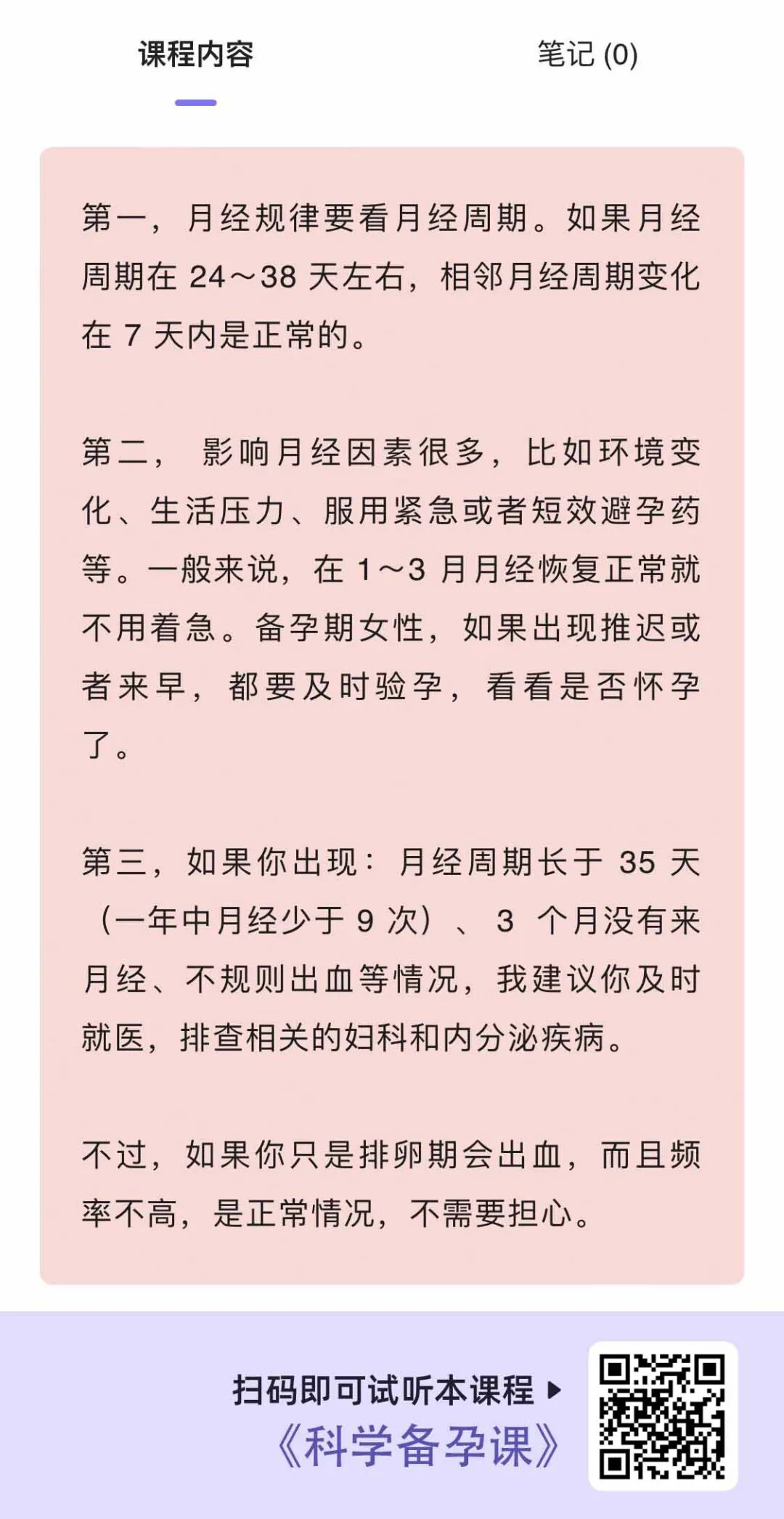 所有的注意事项和细则,我在《科学备孕课》中都有详细讲到,从日常护理要点、怀孕技巧到解读月经信号、常见妇科问题的应对,不让大家错过怀孕良机,轻松怀上优质宝宝。