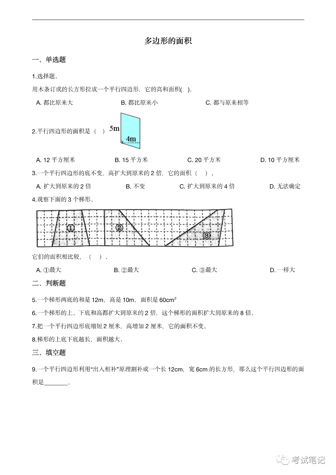 五年级数学专项训练:《多边形的面积》练习题,适合孩子练习、期末复习!