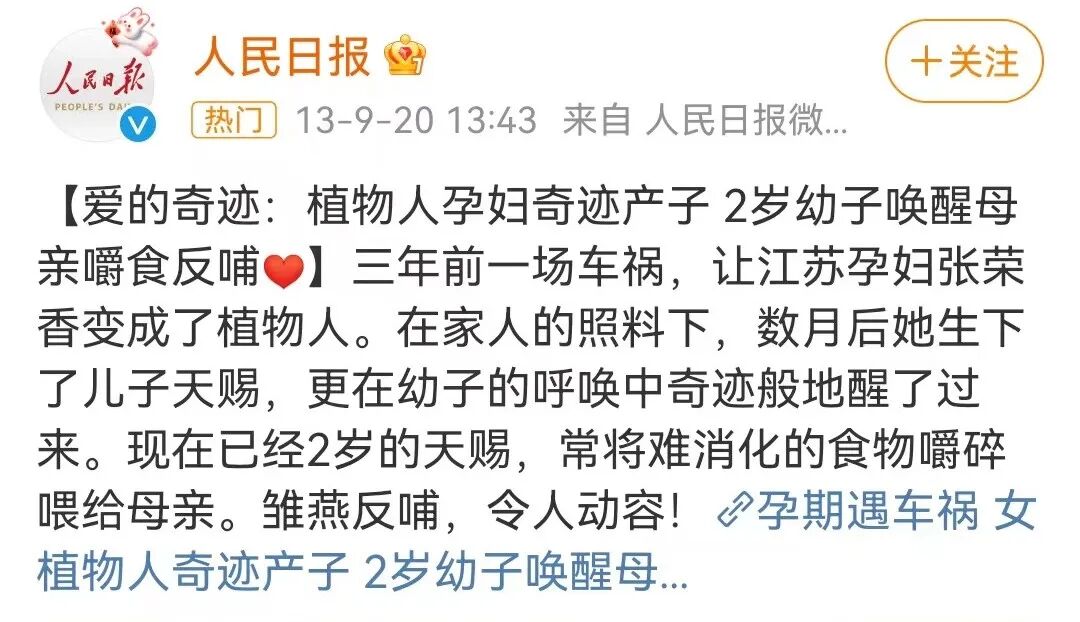 张荣香自从成了植物人,身体都是靠营养液和流食获取能量,腹中的胎儿竟然可以发育成型,还顺利出生,不能不说是个奇迹。
