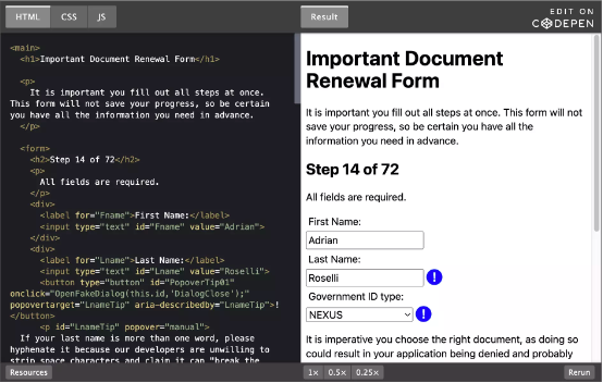 这个演示页面,模拟的是我们怎么争分夺秒地填写一份复杂的多步骤表单。当用户点击切换提示来获取关于当前字段的更多信息时,系统会弹出一个对话框,提示用户除非点击按钮、否则将会被注销。但这个延时按钮被切换提示给挡住了。用户按下 Esc 想关闭切换提示,但关掉的却是对话框。也就是说,用户没法正常延长注销时间,只能眼睁睁看着自己已经填完的内容全部作废,然后气得骂娘。