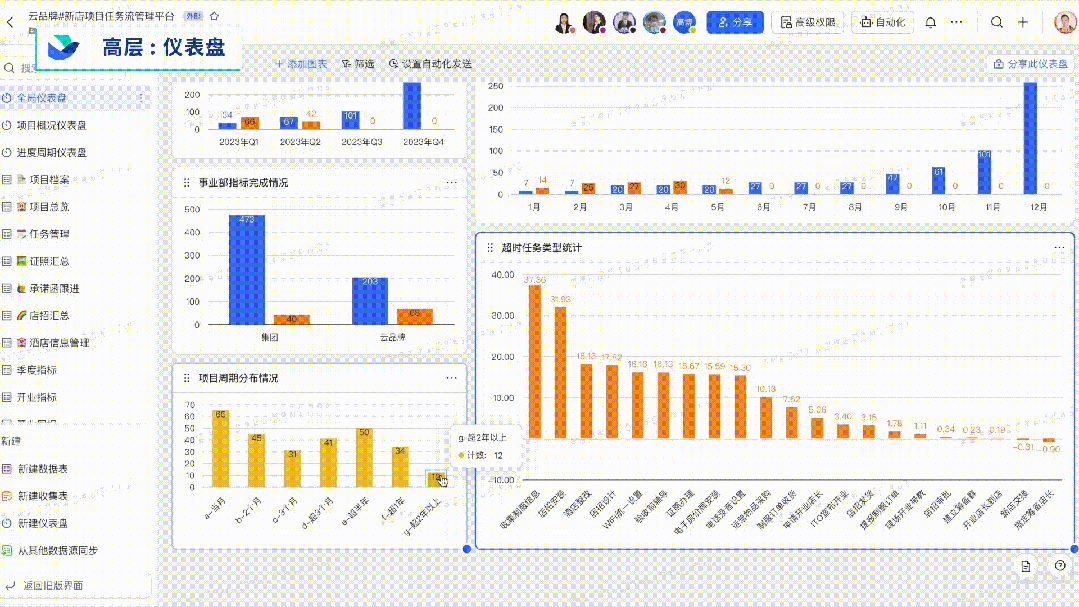 不用做?领导看啥呀?这是领导想开了还是想不开了啊?这时,黎叔给我展示了一张仪表盘。指标完成度、超时任务类型、项目周期分布......这些数据都是实时更新的。领导自己点进来看就行。如果感觉哪个开店指标不达预期,轻轻一点,就能看到详细信息,了解项目进展为何不顺。