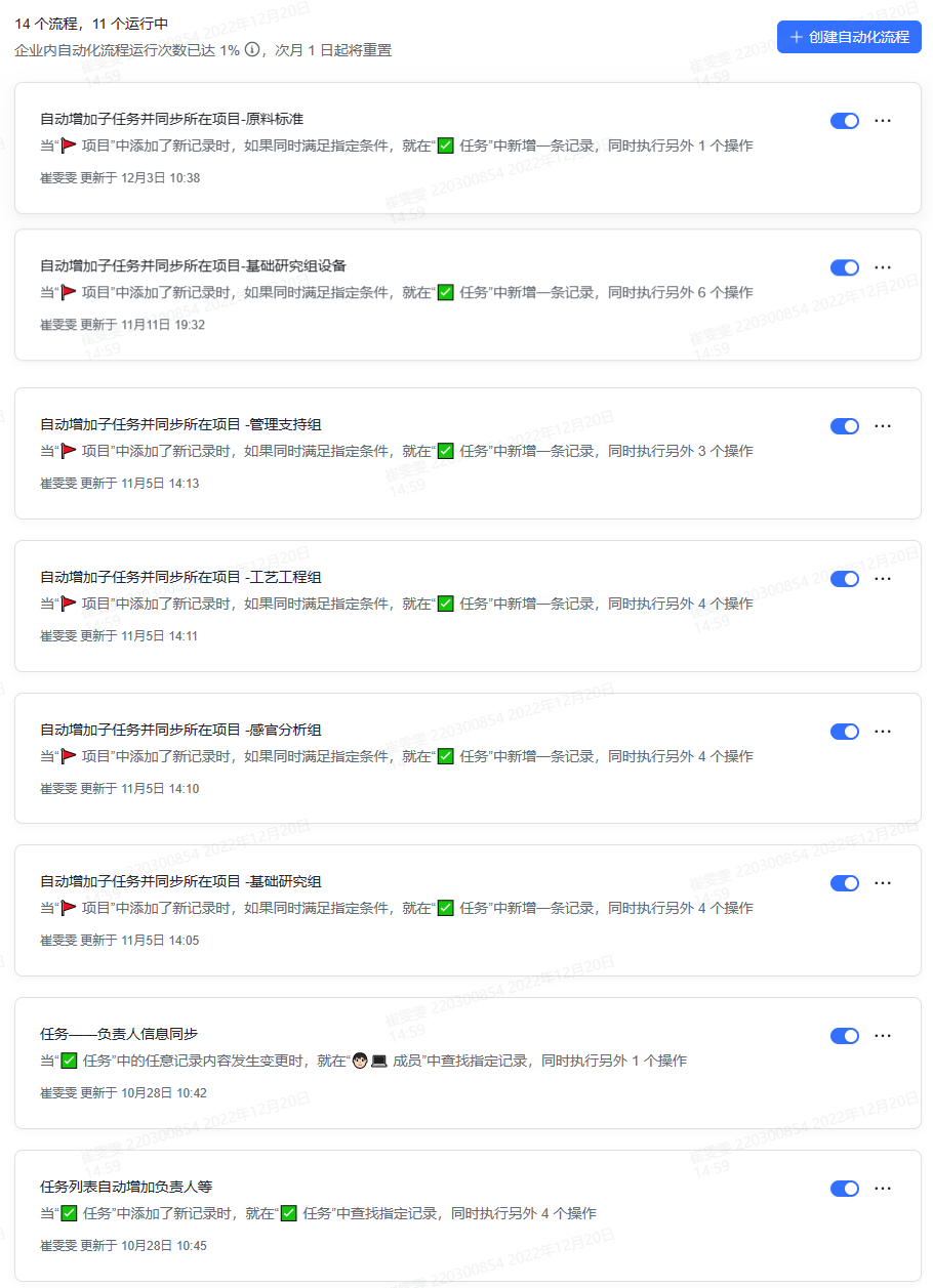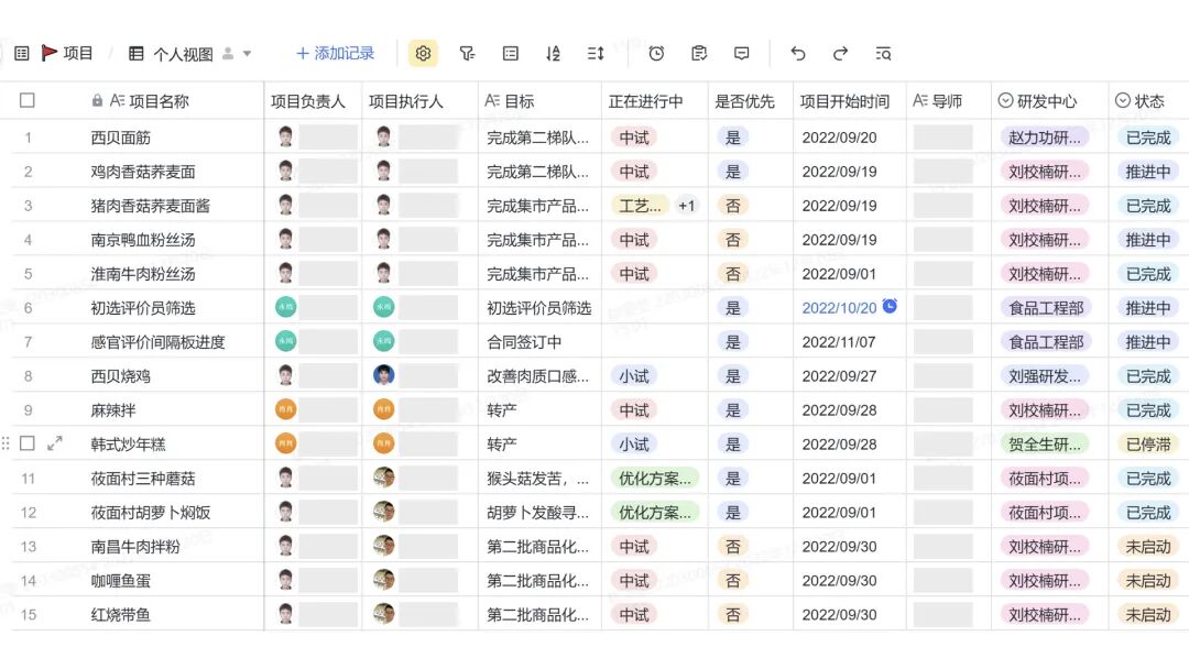 她看我眼睛里透出一丝怜悯,跟我说,那样的日子早就过去了,她们食品工程部有300多个产品研发的项目,都放在多维表格上管理,表单提交立项,如果有新产品的研发,就自动录入数据库了。而且设置了自动化流程,项目开始时间和执行人,根据项目类型,它自动就带出任务了,比人盯着高效多了。