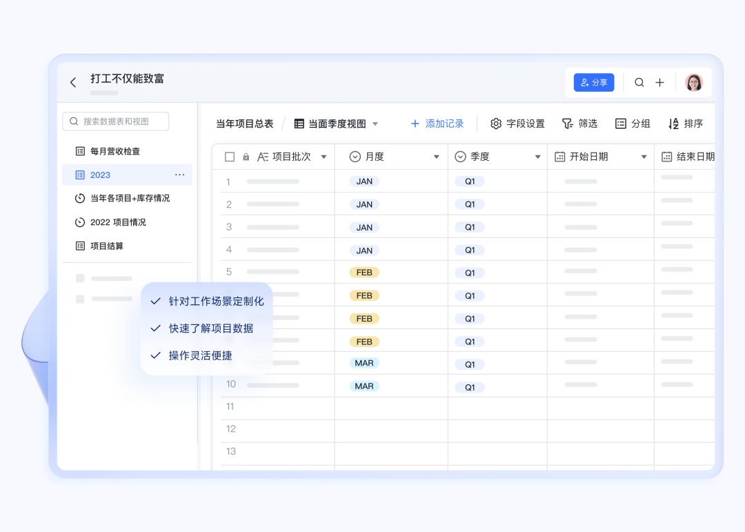 她告诉我,她只建了一张总表,利用“分组”和“筛选”的功能,将管理数据整合,客户、负责人、团队成员看同一张表,但只看到和自己相关的内容。开不同的权限,就解决了。既做到了数据安全,又把所有协作方串起来了。