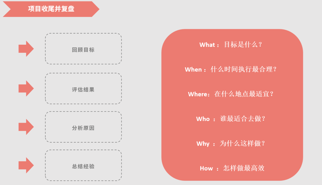当然也可以用5W1H的方法,将一种将疑问拆解成多个小问题来进行分析与思考的方式。同时复盘也是一种提问方式,除了利用以上所说的4个步骤,更重要的是通过左栏的那些问题,来让自己达到复盘的目的。以上是组织一个项目的简要流程,项目过程中会有很多复杂的问题出现,但发挥项目经理的能力,最终都能顺利解决。![]()