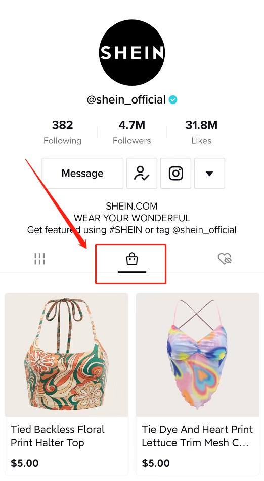 此外,在账号个人主页上也可以添加独立站的网址,用户可以点击网址跳转到独立站店铺上,像正常网购那样选择商品并完成下单流程。TikTokShop是TikTok官方开设的线上店铺,需要卖家填写资料和证明来申请入驻,相当于卖家在TikTok上重新注册一个新的店铺。商家将产品发布到店铺中后,用户就可以在TikTok账号的个人主页那里看到购物橱窗了;SHEIN-TikTok账号主页购物橱窗