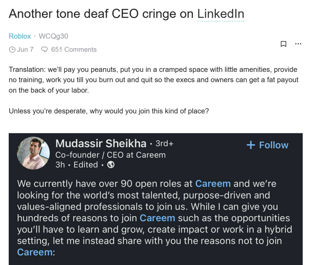 然而,Mudassir Sheikha 这篇帖子的走向,却不同寻常:“虽然我可以给你数百个加入 Careem 的理由,例如你将有机会学习和成长,能创造影响或在混合环境中工作,但接下来我要和你分享不加入 Careem 的理由。”