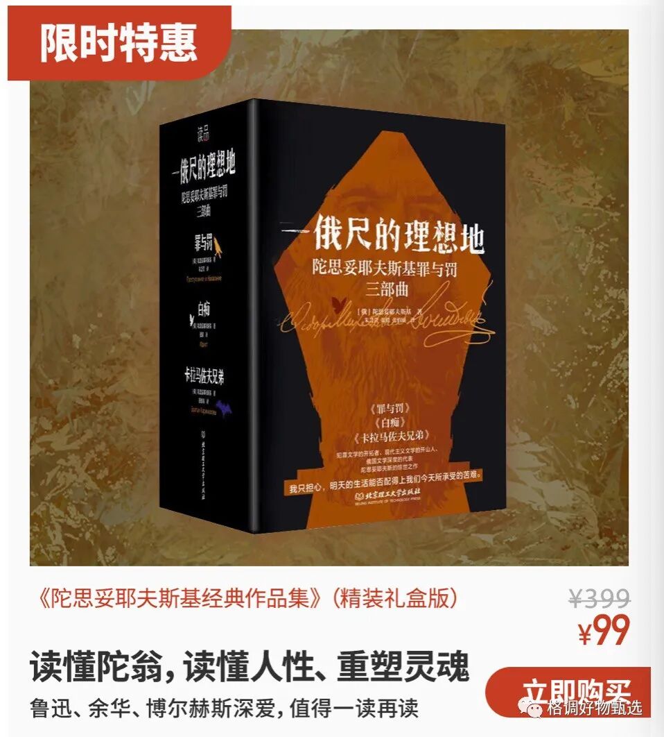 黑塞、尼采、加缪、卡夫卡、村上春树、余华、罗翔、极少有一个作家,能够让文学、哲学、心理学、法学等众多领域的大师,都对他顶礼膜拜。伍迪·艾伦、今敏、李安、滨口龙介的影片里,都能看到他们阅读陀氏的蛛丝马迹,连《武林外传》中的吕秀才都不忘致敬这位“伟大的俄国作家”。贫穷、孤独、病痛、痛苦、不幸,他的生活虽然一团糟,但从未停止与世界的对抗。他有理由仇恨这无望的生活,却将爱视为永恒,告诉你:“爱具体的人,不要爱抽象的人。要爱生活,不要爱生活的意义。”很多人都叫他陀神,而他的作品则“值得十颗星,是能重塑人灵魂的神作”。有人说,“读过陀思妥耶夫斯基的我,与之前的我,是截然不同的两个人。”读陀思妥耶夫斯基,会让你变得勇敢与智慧,敢于直面阴暗的人性、敢于审判复杂的灵魂、敢于探索无穷的真理。一直觉得,所谓书,必须是砍向我们内心冰封大海的斧头。如果你还没有读过陀思妥耶夫斯基,推荐你这套《陀思妥耶夫斯基作品集》(精装礼盒版)每一本都是传世之作。每一则故事,都诉说了无尽的犯罪、爱情与人性。《罪与罚》,陀翁成名作,抽丝剥茧地剖析了一个罪犯的内心世界,一部举世公认的世界文学名著。《卡拉马佐夫兄弟》,陀翁未完成的遗作,包含他毕生的哲学与思考,居于豆瓣外国文学排名榜首。(2023年5月数据)如同托尔斯泰所言,对于知道它的价值的人来说,它与几千颗钻石不相上下。全套4册,原价399元,现争取到了特惠骨折价,直降300,限时优惠99元。不到两张电影票钱,却能让你拥有千百部电影也比不上的观看感受,进入人类灵魂的至深处。为什么劝你一定要读