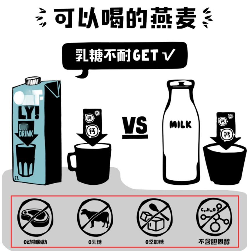 燕麦奶的制造工艺,是燕麦和水混合后研磨,加入天然酶,加速燕麦中碳水化合物的分解,如果简单理解,燕麦奶,就是燕麦版的米汤。但按照国内的标准,《植物蛋白饮料豆奶和豆奶饮料》标准的相关规定,每100克低于2克含量蛋白质,只能算饮料。1克的Oatly更准确的说法是“燕麦水”,但取代牛奶这个碰瓷营销,无疑拯救了这个品类。 ![]()