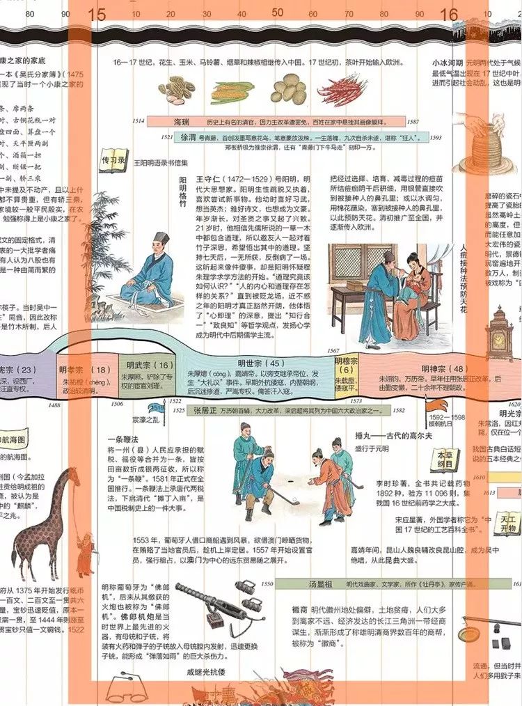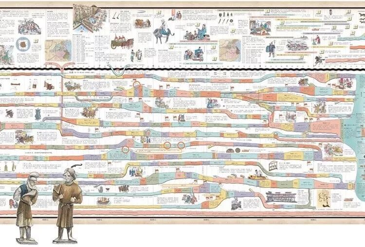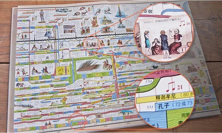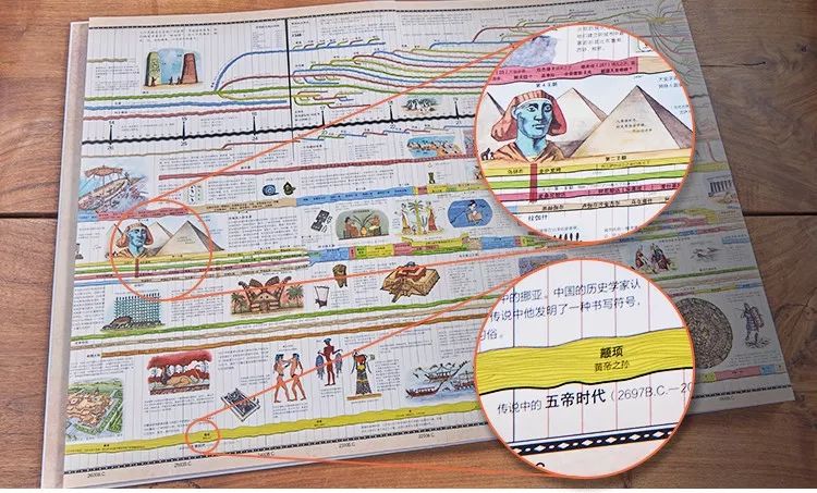 它的英文原版是历经140年而不衰的“神作”——1871年横空出世的《亚当斯历史图表》。它曾于美国百年博览会连展6个月,被欧美无数教育家赞为“奇迹”;更被广泛地收入美国学校和公共图书馆,连大作家马克·吐温也想拥有。内容形式和中国历史长卷类似,但这本不同的是,能培养孩子的世界观。沿着纵轴,我们可以看到同一时间,世界上不同大陆正在发生的一切:○ 看!当世界上最大的胡夫金字塔建成的时候,中国正处在上古五帝时代;○ 孔夫子、佛陀释迦摩尼、苏格拉底三大思想家,竟都生在了同一时代!▲卷上每隔约1厘米,便会有一道红色的10年线,每隔约10厘米,便会有一道黑色100年世纪线。当别人说起某事,孩子恰能知晓同一时间中外发生的大事件、小趣闻。不仅能凸显孩子的知识渊博,更能培养孩子看待问题的全局观。5000年历史,犹如皇皇巨著,怎么就能变成一本轻松易读的画册呢?为了让繁杂的历史清晰易理解,这本书用坐标系定位一切知识碎片,彩色世系表展现王朝的变迁。注:长卷上每13毫米是10年,13厘米就是100年!注:整本书以一条主线串联,上下分散支线。上述自五帝时代,下至1912年清朝结束。中间的主线隐含有中原的意思,代表中国政治和文化的中心;支线主要是一些少数民族政权、诸侯国及割据政权。只需要循着坐标系和世系表的指示,民族的融合、王朝的变迁、时代的更迭,中国历史发展的清晰脉络和重要节点便可一目了然。想看哪个朝代、哪个年份,就直接“按图索骥”,轻松、直观又有趣。掌握历史全局观的同时,还避免了不必要的知识检索过程,学历史再也不会感觉吃力了。横向对比国内、中外,给你上帝之眼,满足好奇心、培养全局观。你想不想知道世界这头发生着某件大事时,其他地方的人正在做什么?看这本书,你就像“通了天眼”一样,对整个世界历史有了更广泛的了解。即便是在国内历史轴线上,你也会发现同一时期,这片神奇的大陆上正在发生不同的事情。例如当中国正处学术自由、百花齐放的春秋战国时代时。地球另一边的古罗马、希腊文明也正璀璨无比。当别人说起某事,你恰能知晓同一时间发生另一有趣的事情。这不仅凸显你的历史素养深厚,更有助于培养孩子用多角度看待问题。在这里,发现生动有趣的冷知识!爱上历史,也让别人爱上与你聊天! 编辑说:“我们做的不只是记录王朝兴废的历史年表,也是古人家长里短的日常,充满温情的生活” 的确,你若仔细阅读书中内容,你会和我一样,在画卷中发现了一般历史年表所没有的“古代生活百科”——汉代也有健身操!你看看,和现在的广播体操相似度非常高!注:华佗的“五禽戏”,包括了呼吸方法、肢体运动、器械辅助运动、模仿动物等动作要领。唐代就有“高尔夫”!名叫“打马球”,比打高尔夫更难、更炫技!很多女生打的比男生还好!注:唐代妇女地位与男性平等,她们可以与男子一起在马场上竞技。这些生动的图文,让历史在孩子的眼里不再是枯燥的考点,潜移默化的让他爱上看历史,拓展更广的知识面。除了生活意趣,编辑还很用心的画出每个时间点所对应的重要文物,把书与博物馆有机的结合起来。例如四大发明之一造纸术的全过程、曲水流觞的情景再现;满清时期正黄旗等各种旗帜展示、以及司母戊鼎等文物所藏位置、背后的故事全都告诉你。相比课本上晦涩难懂的文字,这些生动形象的图文更能令孩子印象深刻。日后逛博物馆,孩子也不再是走马观花,而是对每一时期的文物如数家珍。与一般的儿童读物不同,这本画卷的内容更侧重于通史角度。不仅是所有历史入门者必读,也很适合做孩子学历史的教辅,为父母省下不少心力。从神话到考古,从新石器时代的满天星斗到夏商石器的逐鹿中原,从秦汉统一到晚清变局。每一时期的文字资料都是编辑参考了大量专业研究资料,将复杂的知识用通俗不失严谨的语言表达。用具、机械等器物的选择皆参考自实物、古籍图谱或后人考据而绘制,参考价值很高。为了使这6米长的画卷更易阅读,特意采用经折装的形式,即可一页页翻阅,也可以拉开、平铺着看。精选优质铜版纸内页,顺滑耐用,即便是铺在地上看也可以。这样一本从内到外都是极致讲究、精美的画卷,藏于书房更衬显主人品味。赠给孩子,让他不只懂得王朝更替、考试考点,还能激发他探索历史的好奇心,从而成为一个有趣有聊的人。○ 谁建造了罗马斗兽场,有多少人可以同时坐在里面看表演?○ 你喜欢什么游戏?古埃及人爱玩一种好像杂耍的抛球游戏,苏美尔人则有非常精致的游戏赌盘;○ 除了吃鸡游戏里先进的枪械,古代的投石机、弩弓、攻城锥等重型武器,才是“武器的祖先”……在轻松的玩耍中学习,让历史在孩子的眼里不再是枯燥的考点,潜移默化的让他爱上看历史。孩子从小读,长大了不是个历史学家、考古学家,也是个博物馆通、历史学霸。太划算了《中国历史长卷》和《世界历史长卷》的套装组合优惠,给大家搞到了福利价哦:![]()